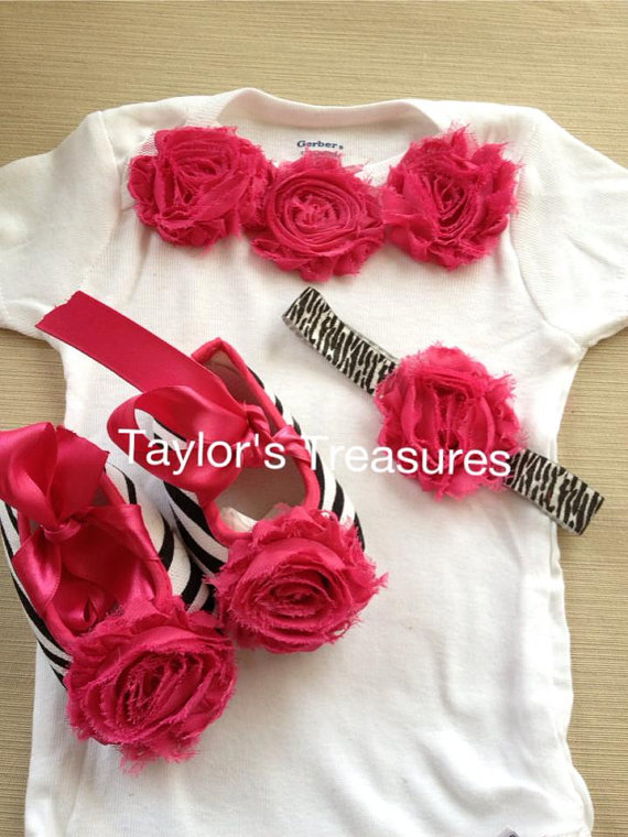 Taylors Treasures - 3pc. Set - Zebra Rosette Shoe With Matching Headband and Rosette Onesie- Great For Photo Prop -